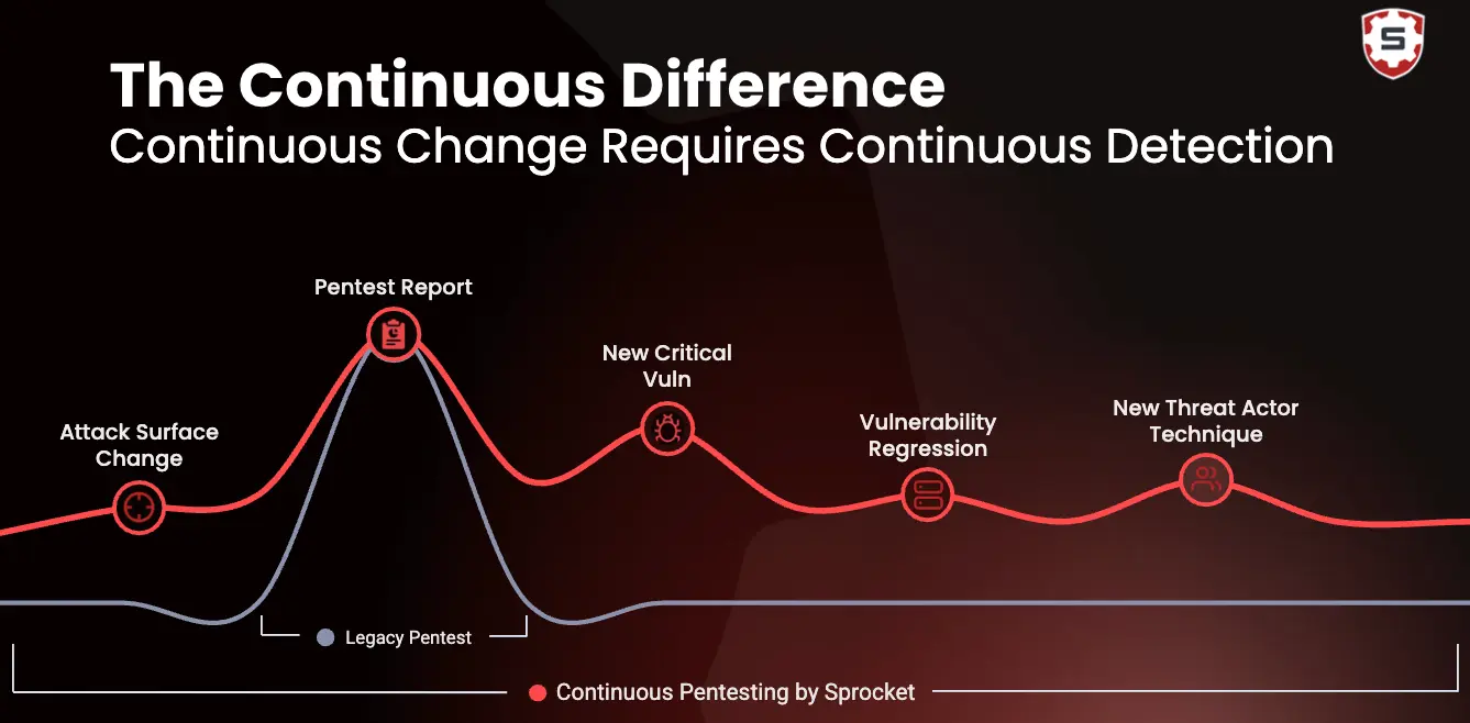 Point-in-time testing fails here because speed favors attackers when testing is episodic. Sprocket Security helps through continuous human-led testing that closes the speed gap. We validate exposures as fast as environments evolve.