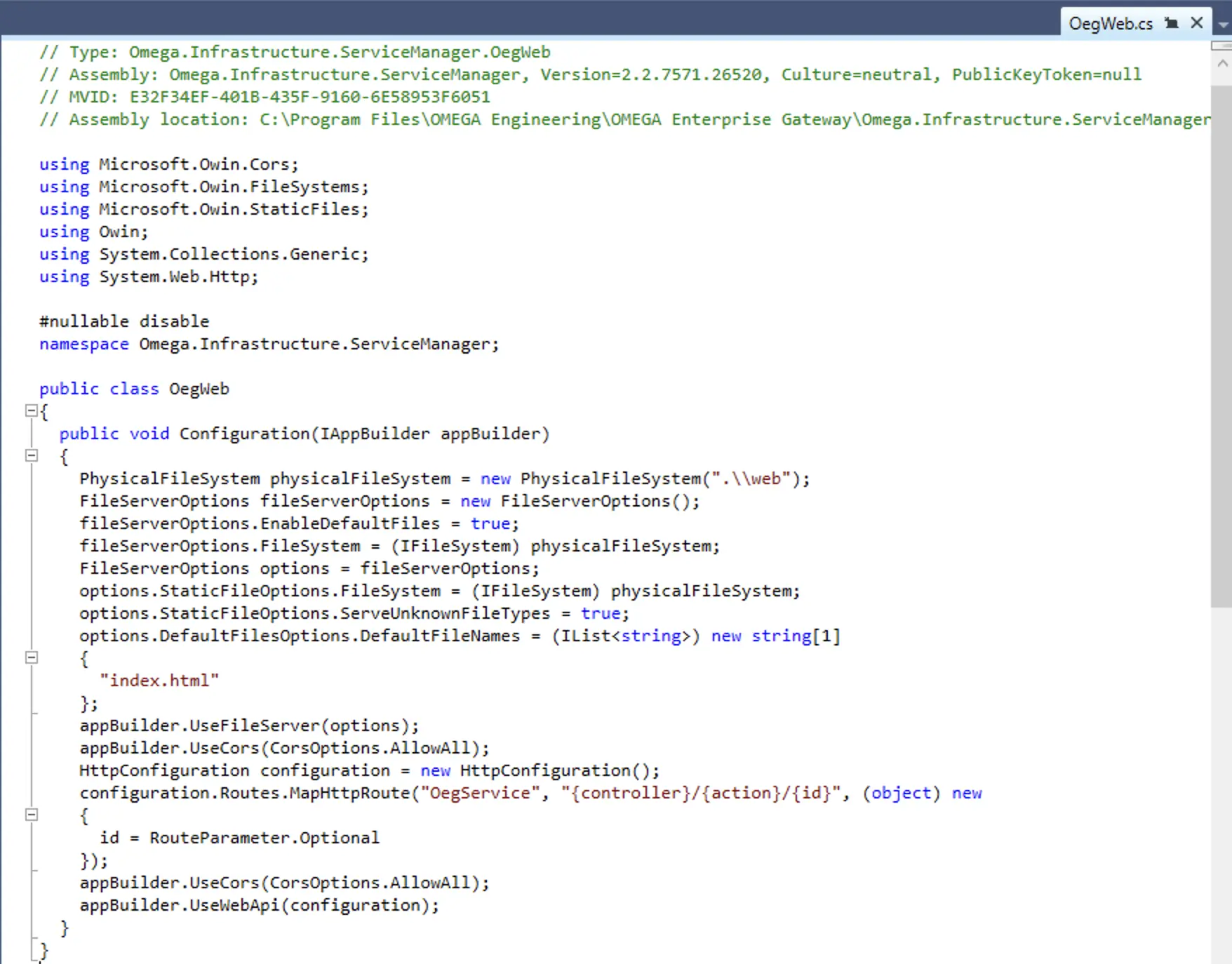 For those unfamiliar, OWIN (Open Web Interface for .NET) is a specification that allows .NET applications to run web components independently of IIS. The Startup class includes a Configuration method where features such as authentication, cross-origin handling, and routing are added to the application's request handling flow. If you are familiar with IIS <modules> defined in the IIS configuration file, you are familiar with this concept already. Same pipeline pattern, same ordering sensitivity, same consequences when misconfigured. The difference is just that IIS modules are declarative (config file) and coupled to IIS, while OWIN middleware is programmatic and runs in any host, including a standalone Windows service like OEG. The takeaway is simple; if authentication isn’t registered in this pipeline, every endpoint behind it is open unless the developer explicitly locked it down.